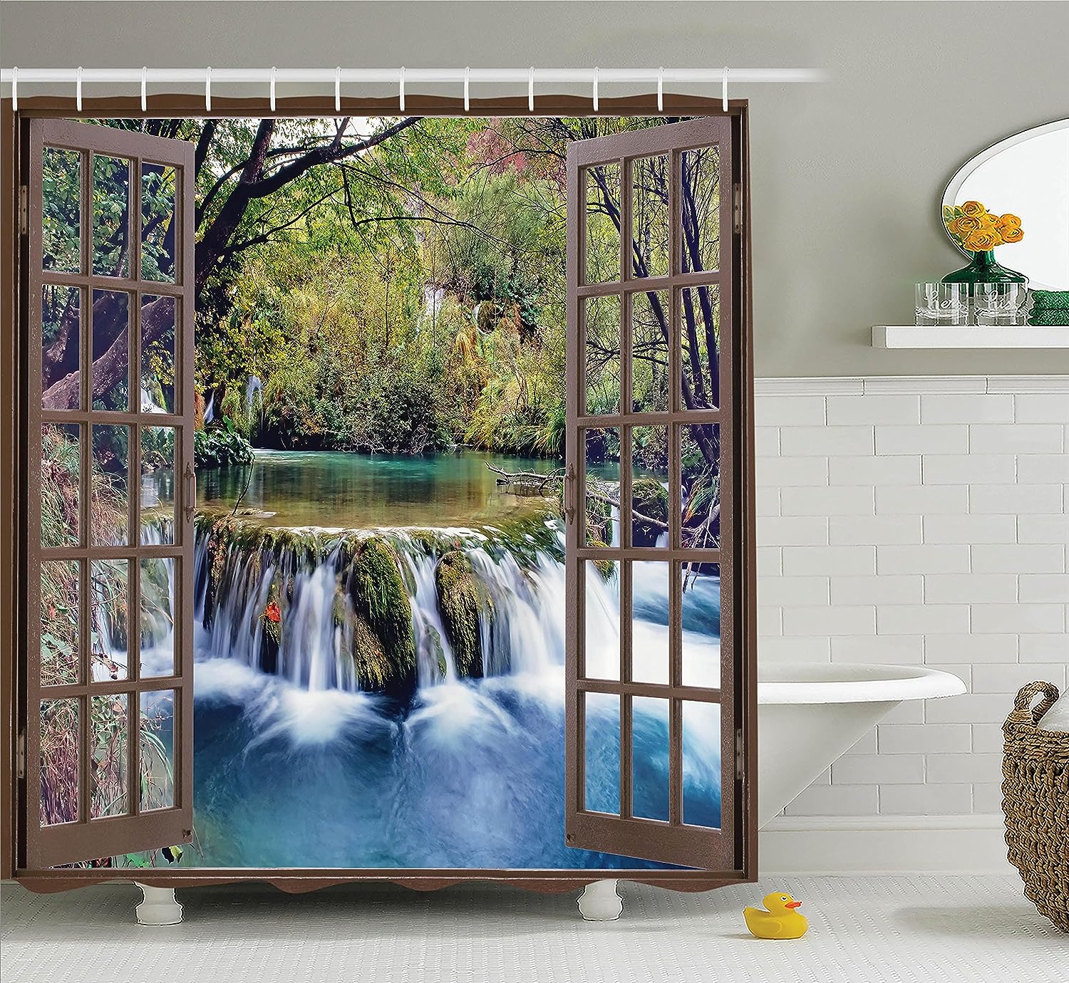 Surreal Forest Waterfall Shower Curtain, Deep Waterfall Viewed From City Window, Cloth Bathroom Decor W, Forest Green