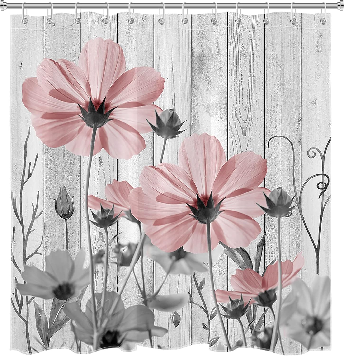 Vintage Floral Pink Shower Curtain with Rustic Farmhouse Grey Flower on Vintage Wood Boards – Wildflower Fabric Bathroom Curtain