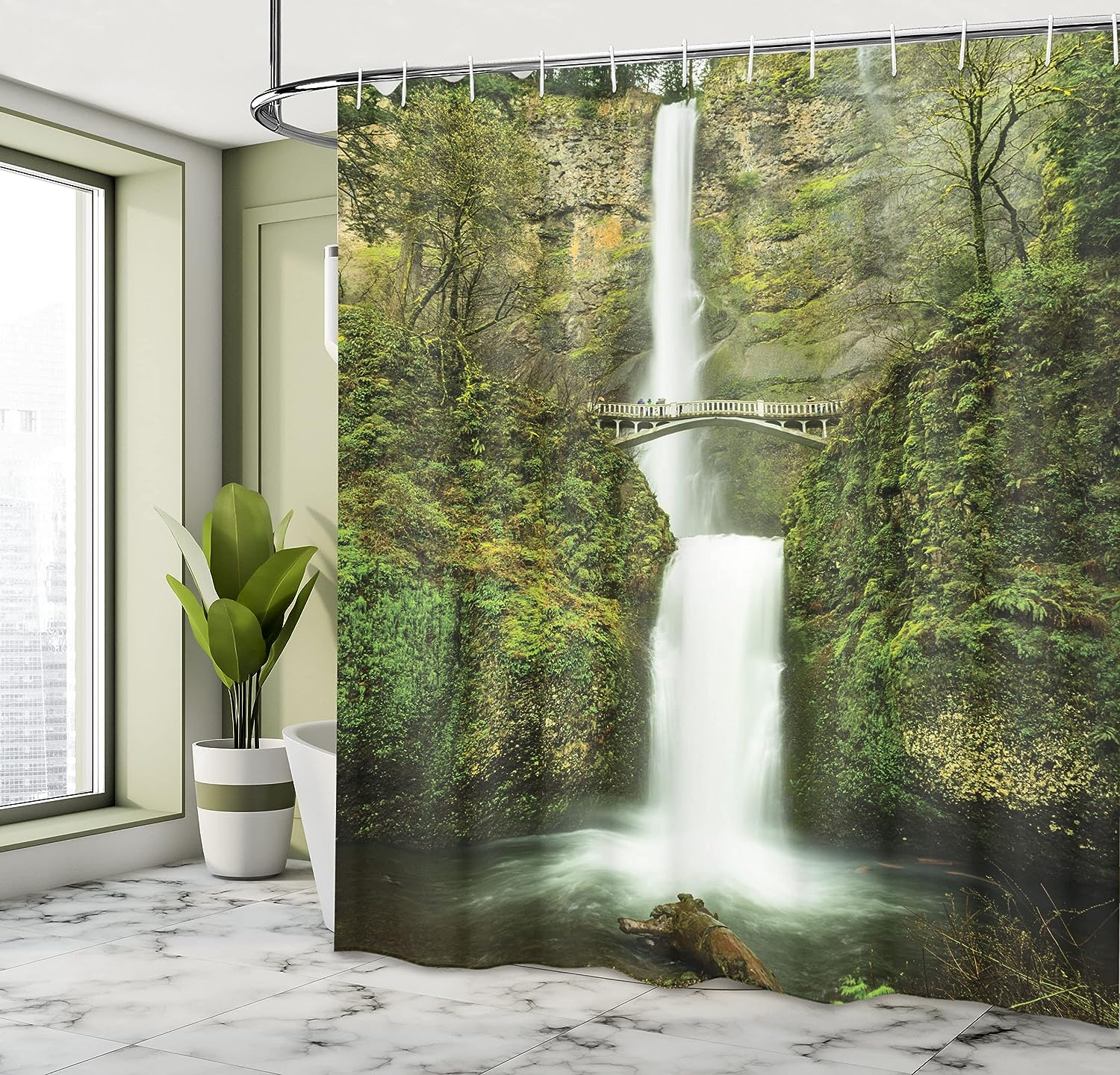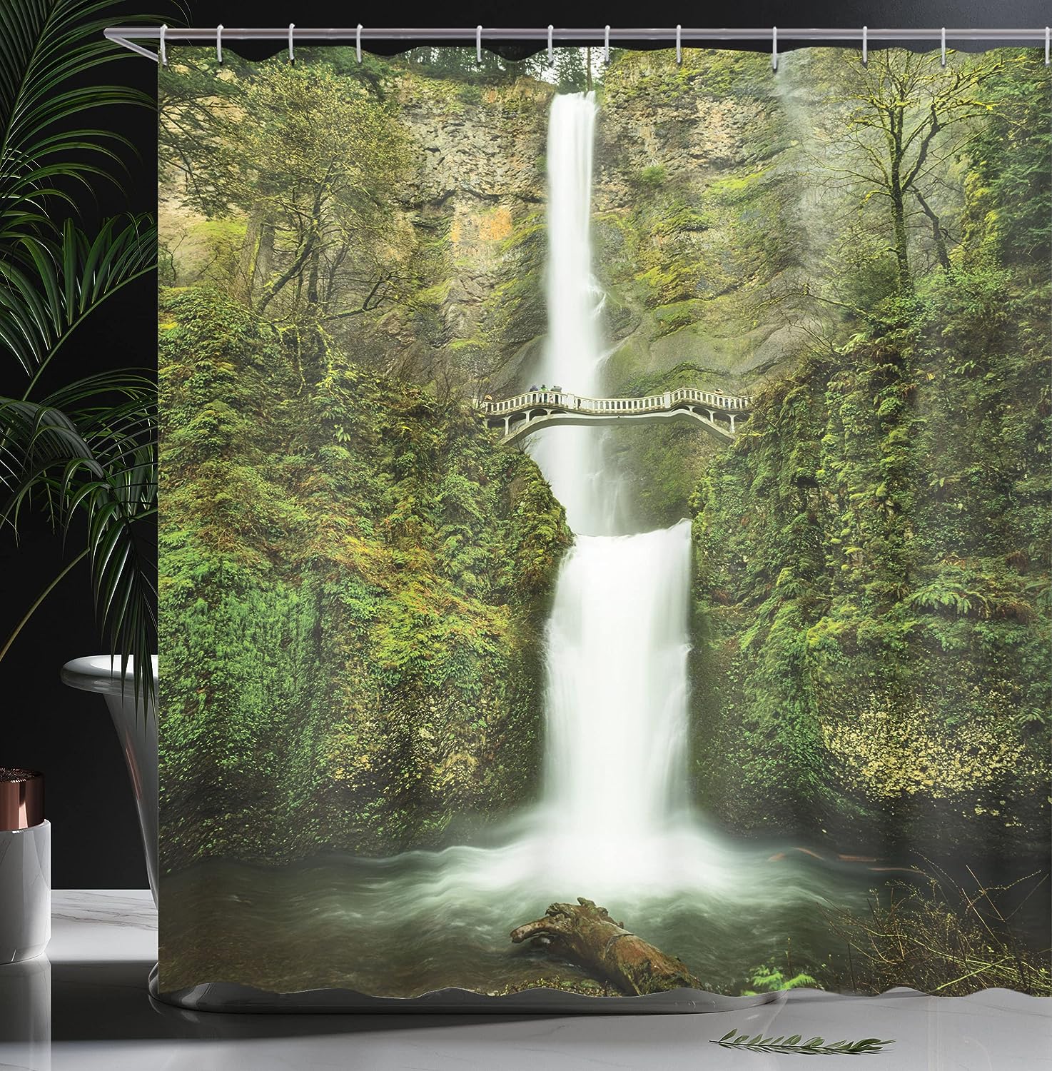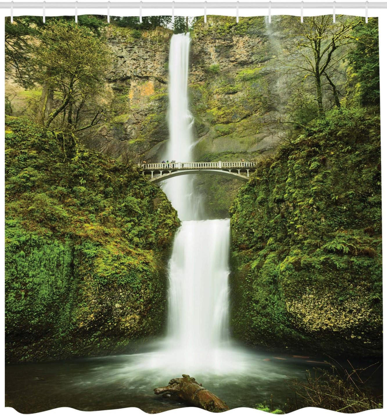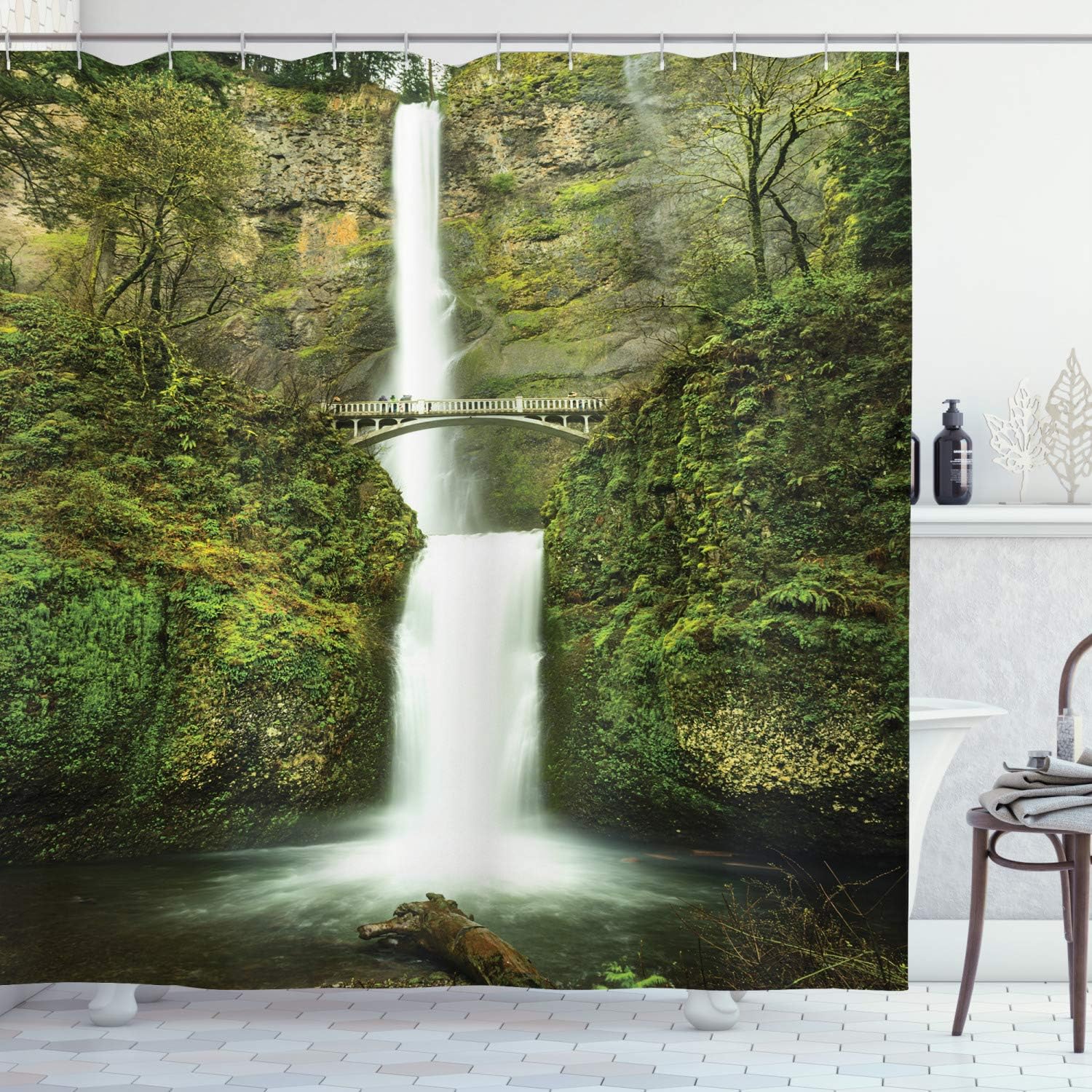Waterfall Nature Shower Curtain, Forest Scenery Falls Bridge Path Print for Bathroom Decor, Green Cloth Fabric