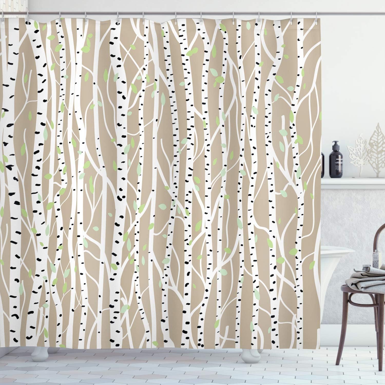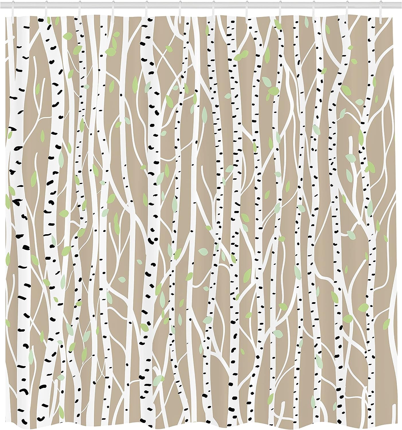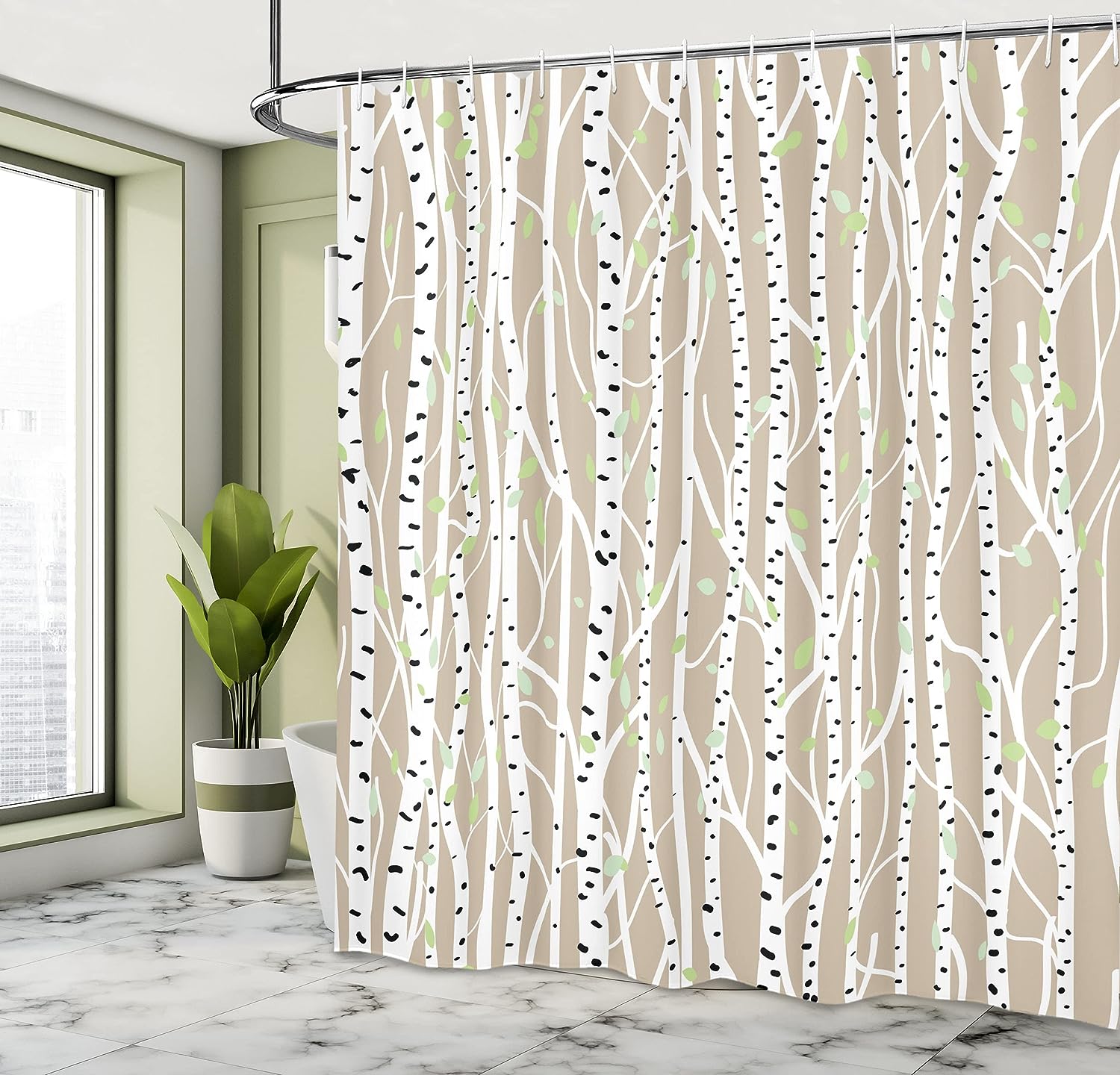 Whimsical Birch Tree Shower Curtain, Fresh Foliage Nature Print Bathroom Decor, Tan Pale Green Black