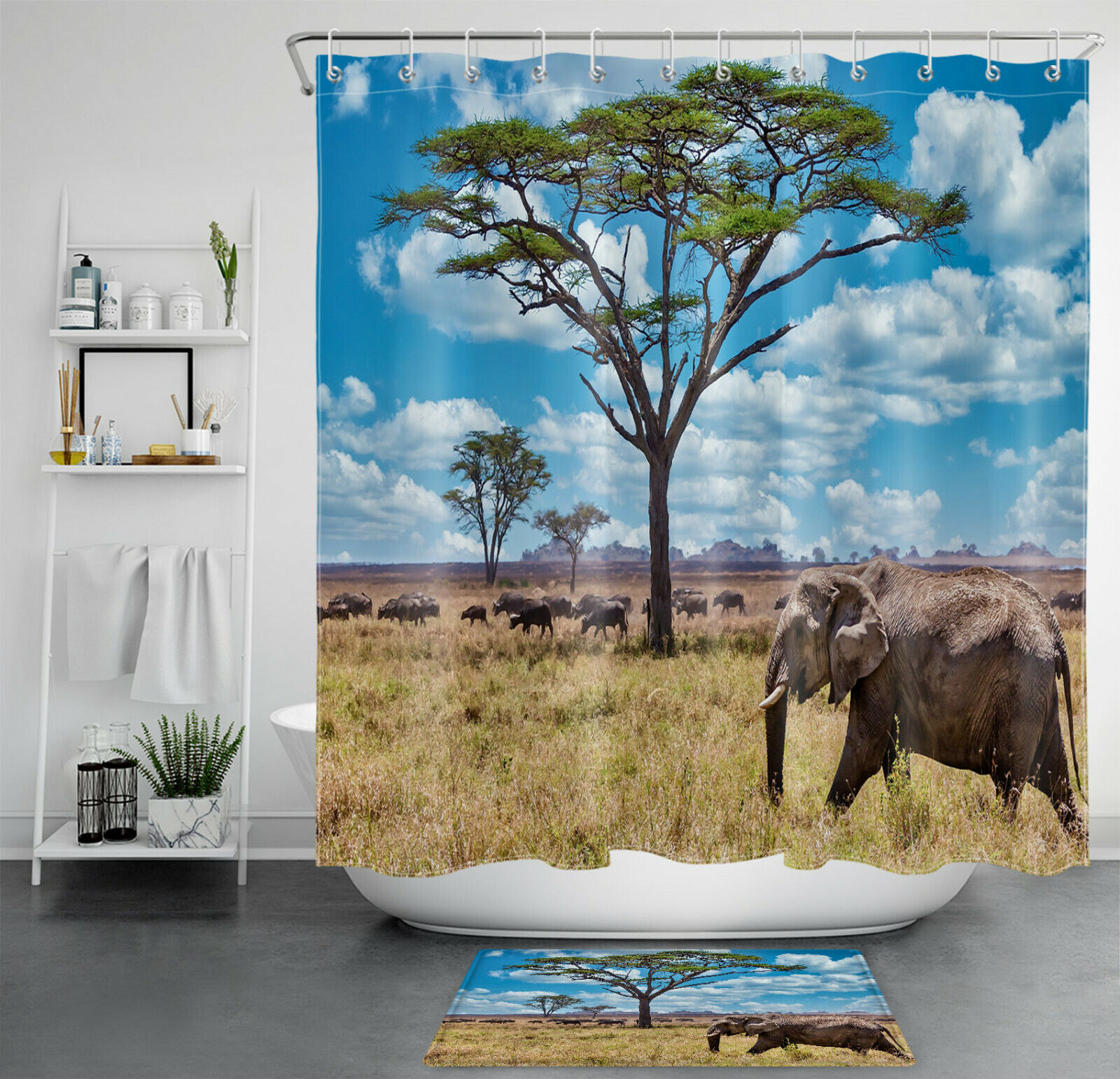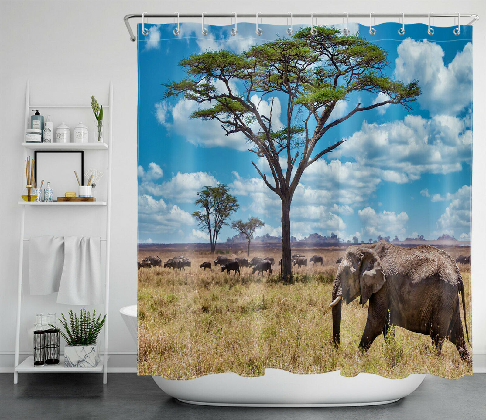 Wild Bison Elephant African Grassland Shower Curtain for Bathroom Decor