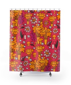 Mushroom And Flowers Shower Curtain, Groovy 60’s 70’s Hippie Mid Century Modern Shower Curtain