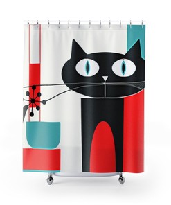Atomic Cat, Cute Black Kitschy Kitty, Retro Mid Century Modern Bathroom Decor Aqua Blue, Red, White,Shower Curtain